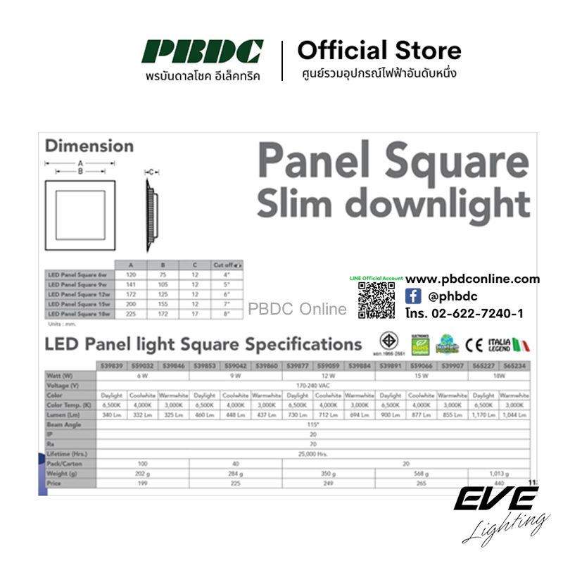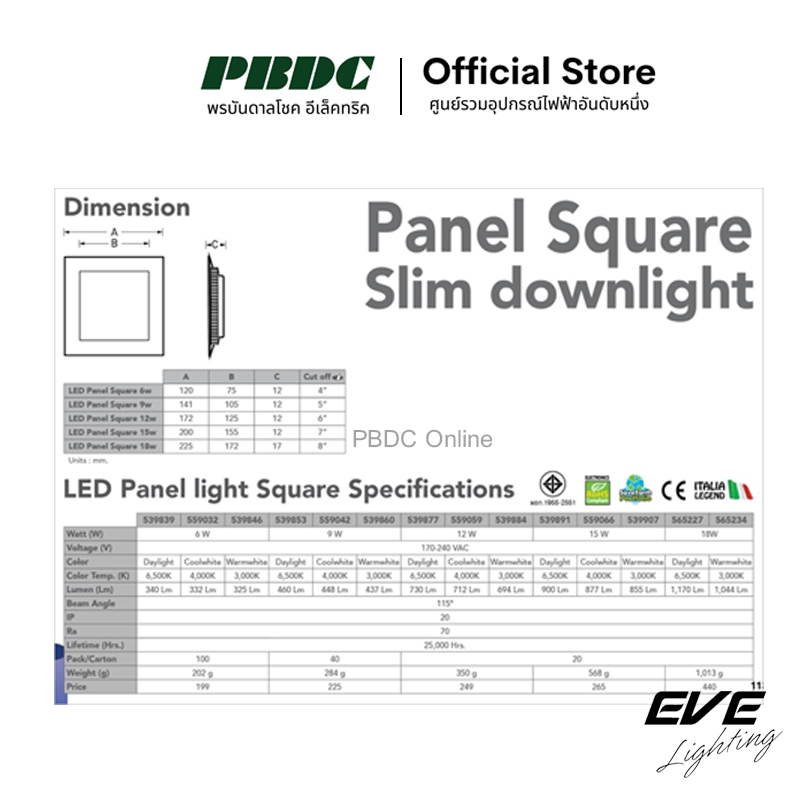 จำนวน Eve โคมไฟพาแนลแอลอีดี 12วัตต์ LED Panel Light 12W รูเจาะ 6นิ้ว แบบเหลี่ยม ชิ้น