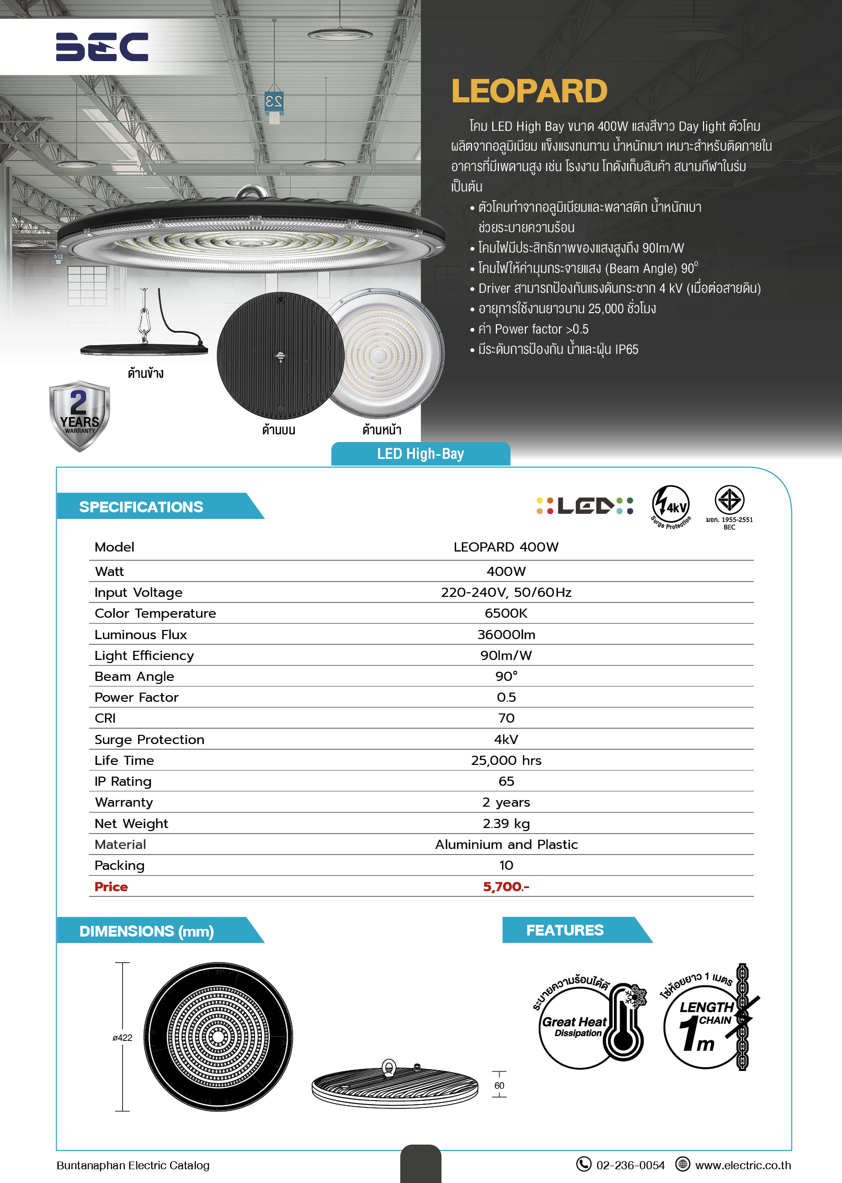 ㆍตัวโคมทำจากอลูมิเนียมและพลาสติก น้ำหนักเบา ช่วยระบายความร้อน